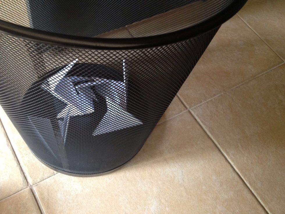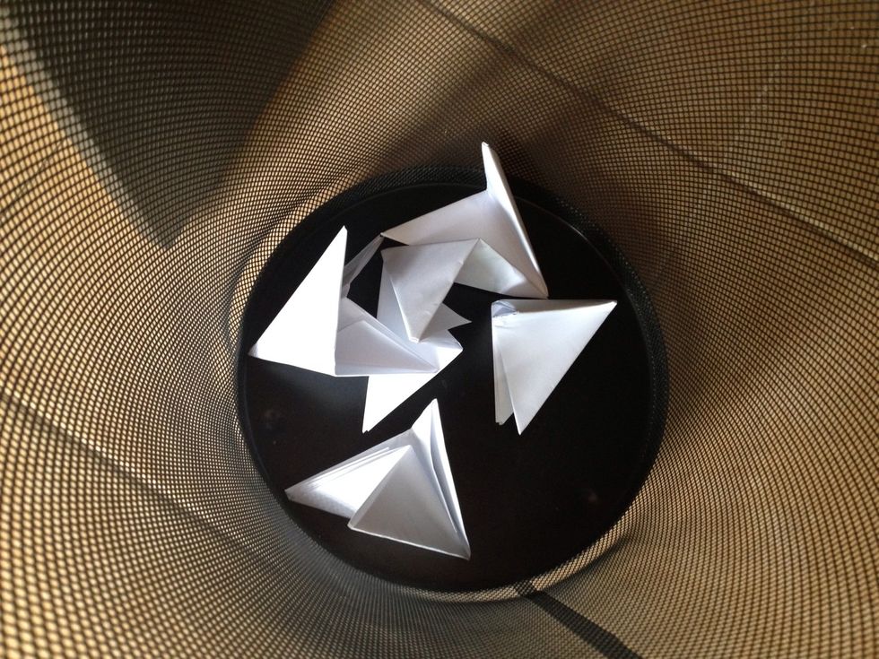 I folded mine more (2 times). This creates the illusion of 'numerous' origami swan-like triangles bound together when inside the bin.
