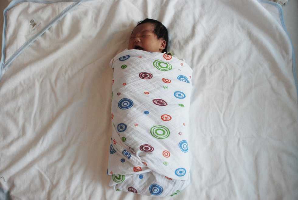 Pull one side of the blanket across the baby's chest. Tuck under opposite Arm. Fold bottom blanket over feet and baby's shoulders.