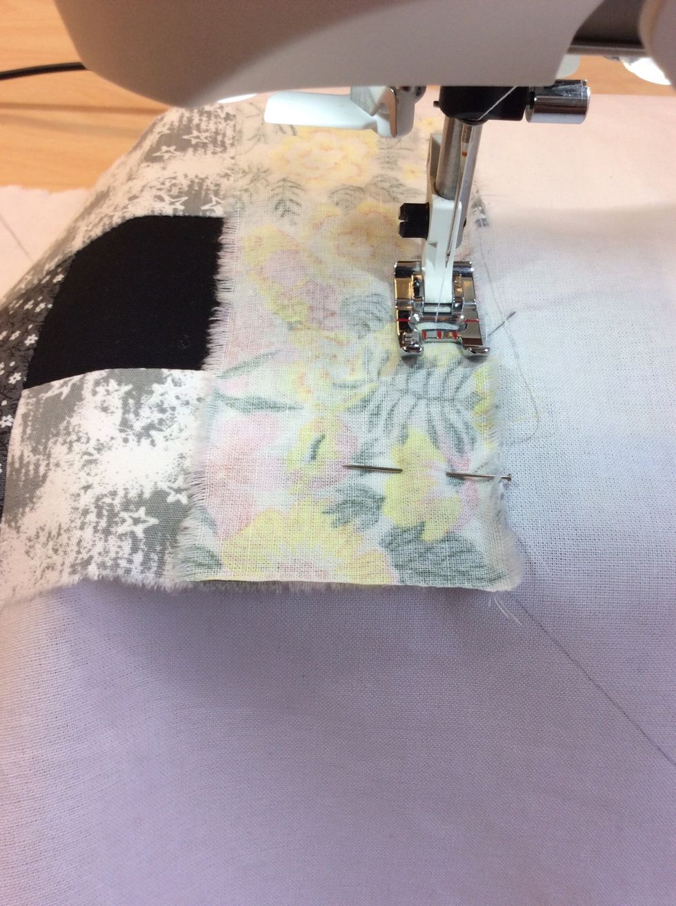 Välj nu ut ett tyg till baksidan. Lägg din lappteknik på tyget du valt med rätsidan neråt och nåla fast tygerna med varandra, en nål i varje hörn. Klipp sedan ut.