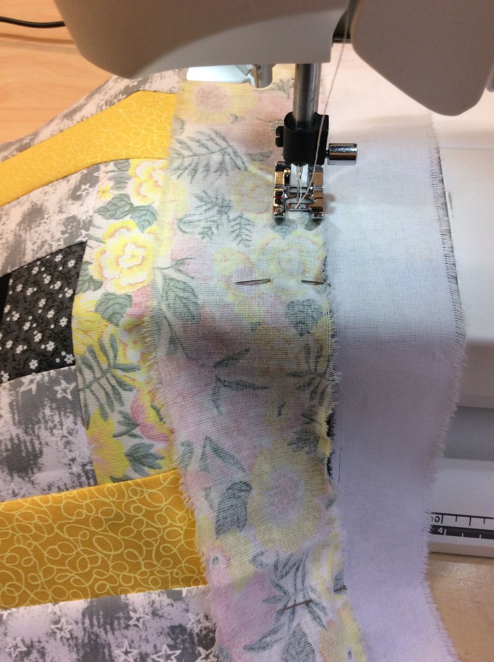 Sy med raksöm, låt kanten på pressarfoten följa kanten på tyget. Glöm inte att fästa tråden genom fix eller backen.