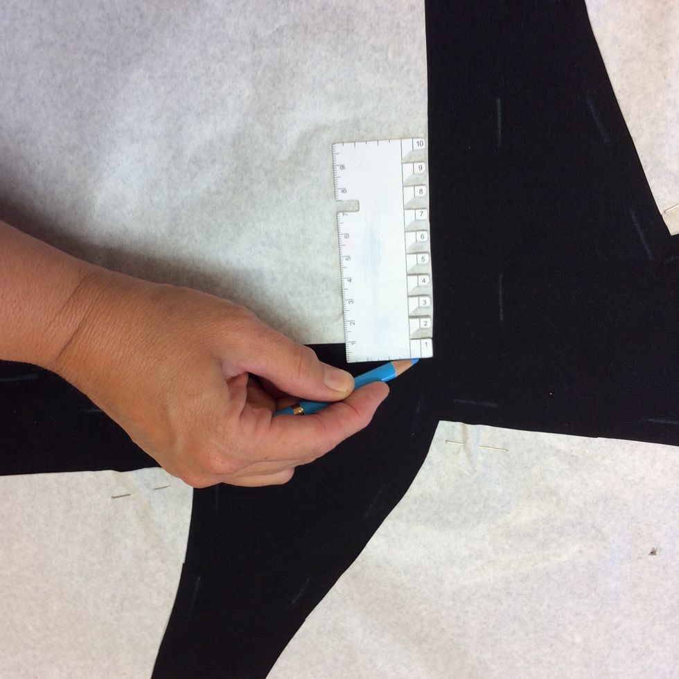 Mät in 4 cm på båda sidorna och sätt en markering med tygpenna.