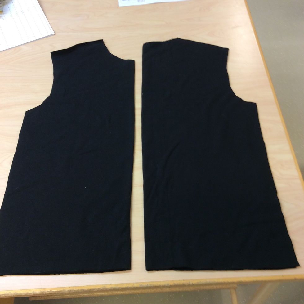 Lägg ihop bakstycket och framstycket räta mot räta (de fina sidorna mot varandra) Tvärnåla ihop axelsömmarna. Se nästa bild för att se bättre.