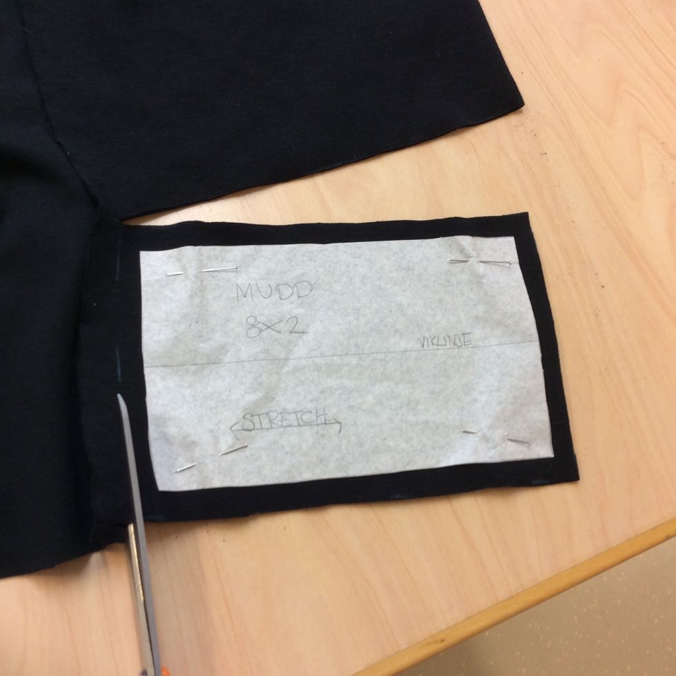 Välj muddtyg till ärmmudden och nåla fast ditt mönster på dubbelt tyg. Se till att strechen i tyget är på rätt håll. Det går att ändra bredden på mudden innan du klipper.
