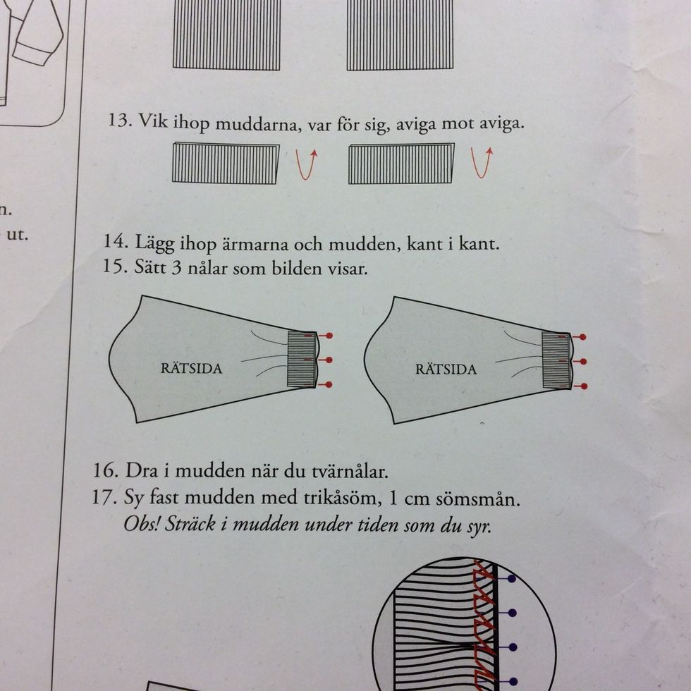 Vik mudden dubbel med rätsidan utåt. Nåla ihop ärm och mudd, du behöver sträcka ut mudden lite för att den ska passa med ärmen.
