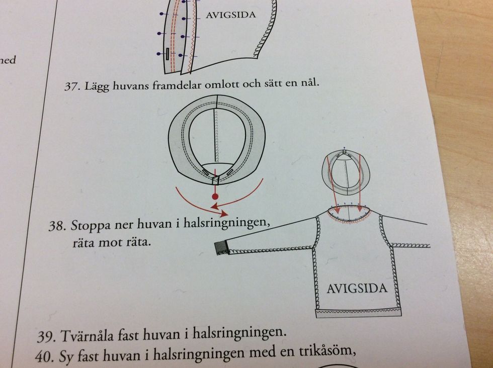 Då ser luvan ut såhär. Vill du ha luvan i dubbelt tyg klipper du ut en luva till och följer sedan steg 39-40 igen.