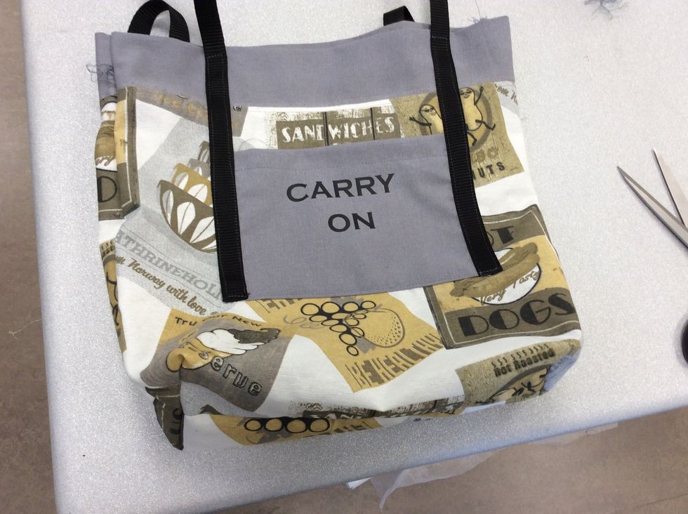 Rita av alla linjer! Lämna plats för en del av väskan till bredvid.Rita även av mönstret på fickan och toppremsan. Glöm inte sömsmån!