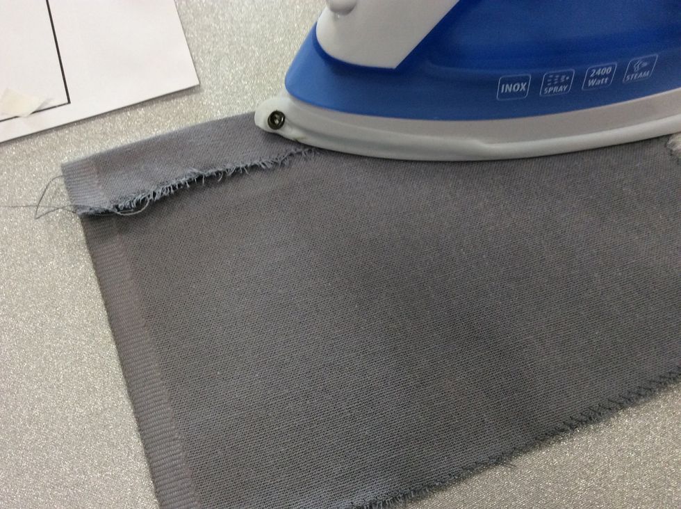 Ta fram fickan och vik ner 2 cm i kanten på långsidan ner mot avigsidan . Stryk.