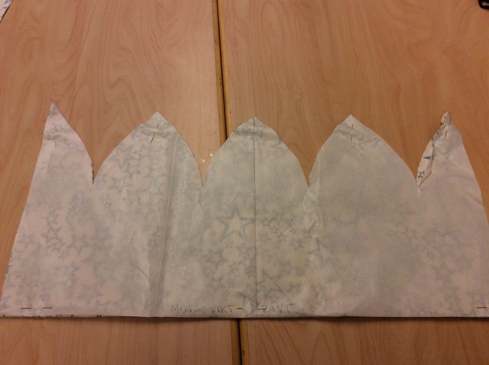 Vik nu mössan som bilden visar. Sy ihop de yttersta 4 spetsarna med söm 3 och med 1cm sömsmån.