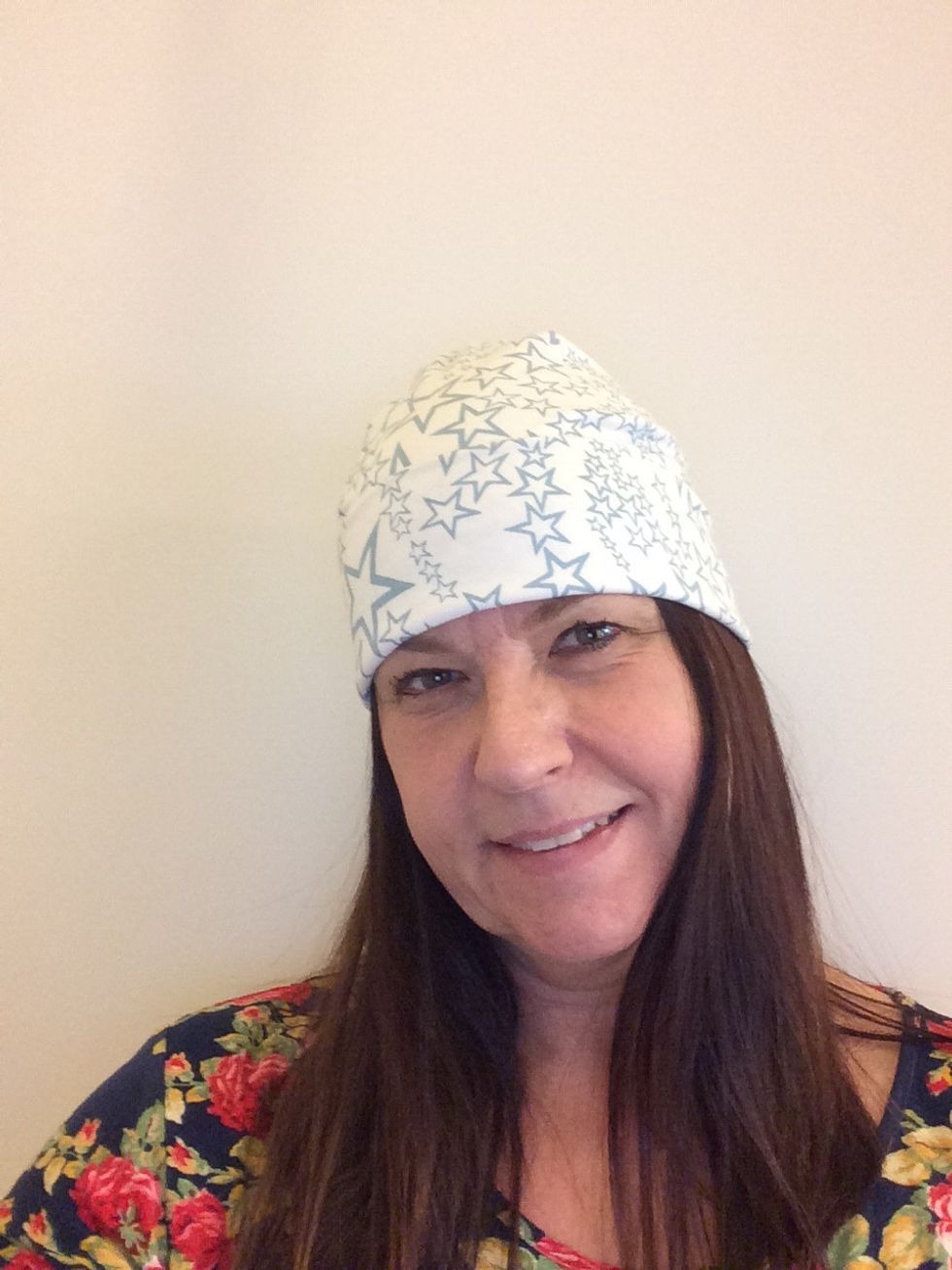 Markera ut ca 7 cm med en tygpenna. Där ska du lämna öppet när du syr för att senare kunna vända mössan ut och in.