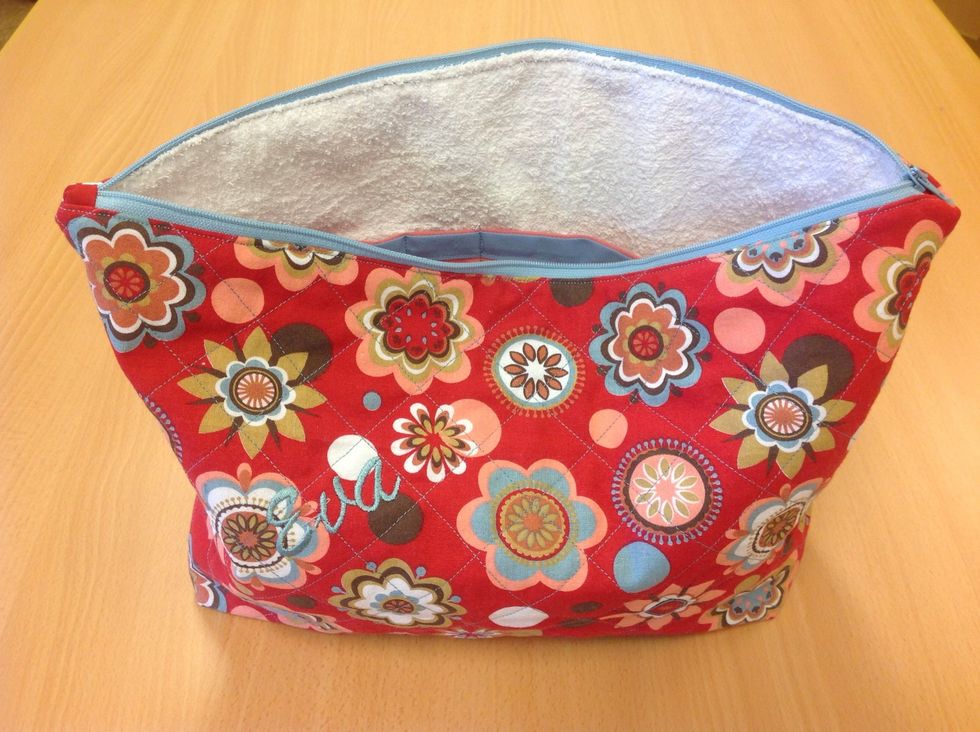 Vänd ut och in på necessären. Vik in kanterna på fodret och sy ihop.