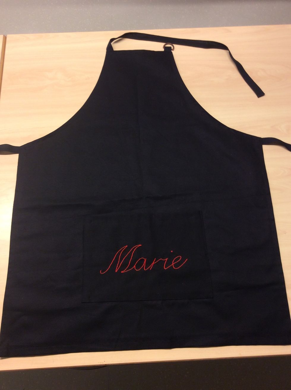 Nu är själva förklädet färdigsytt 😛 Bra jobbat. Nu ska du brodera ditt namn. Vill du ha namnet på en ficka får du börja med att rita/ designa upp din ficka på mönsterpapper.