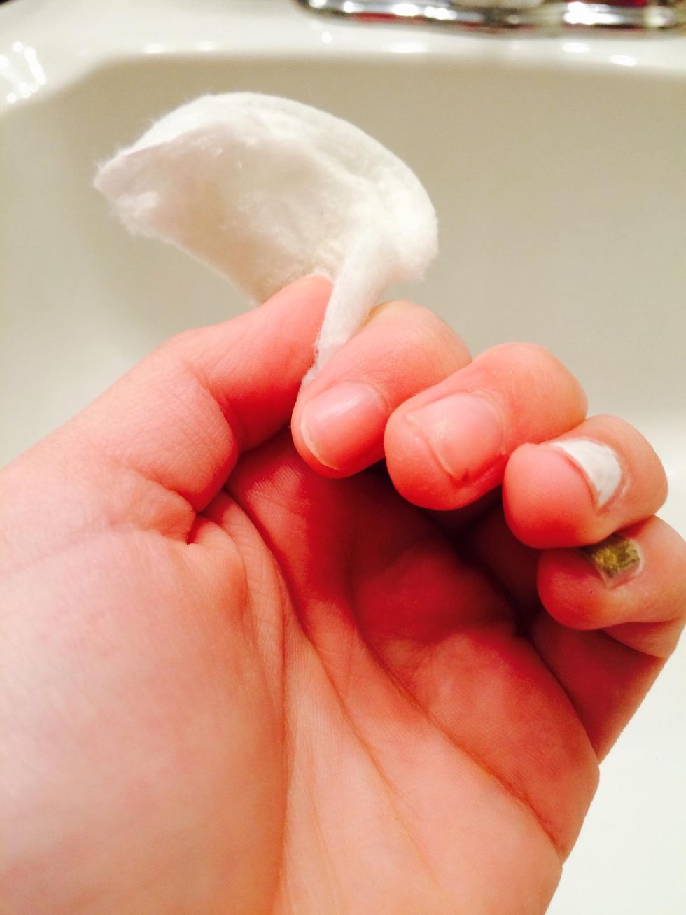 Gather your nail polish remover and cotton padsPut it on your Cotten padFold in halfPlace on fingerFold sides downFinished resultsBye!! This photo was done by Halle Miller