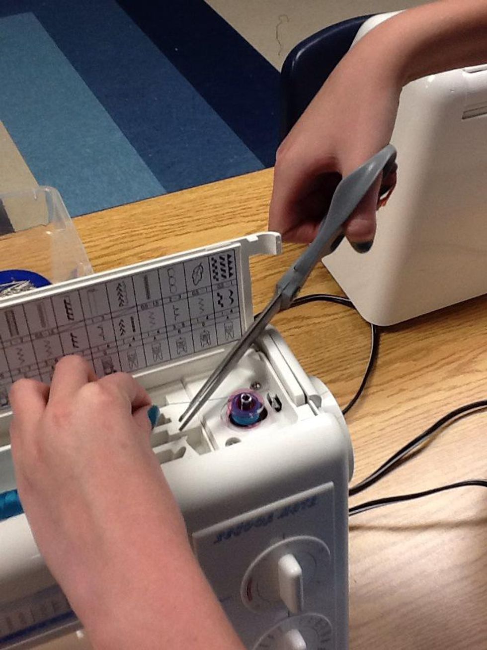 Finish winding the bobbin- pressing on the foot pedal and winding until it is more than half way filled. When done press the bobbin winder spindle back to the left