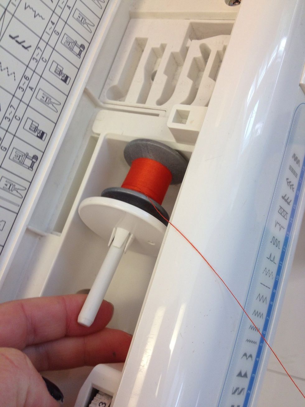 Cover bobbin with plastic cover. Pull long tails behind, away from your machine.