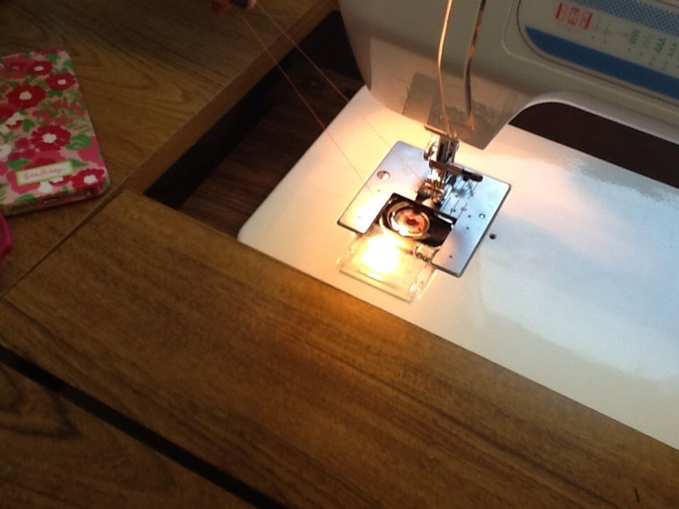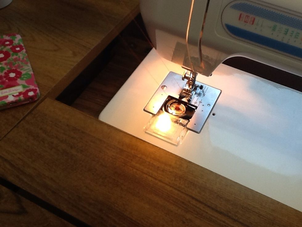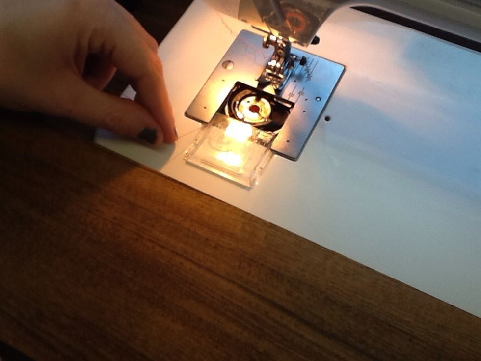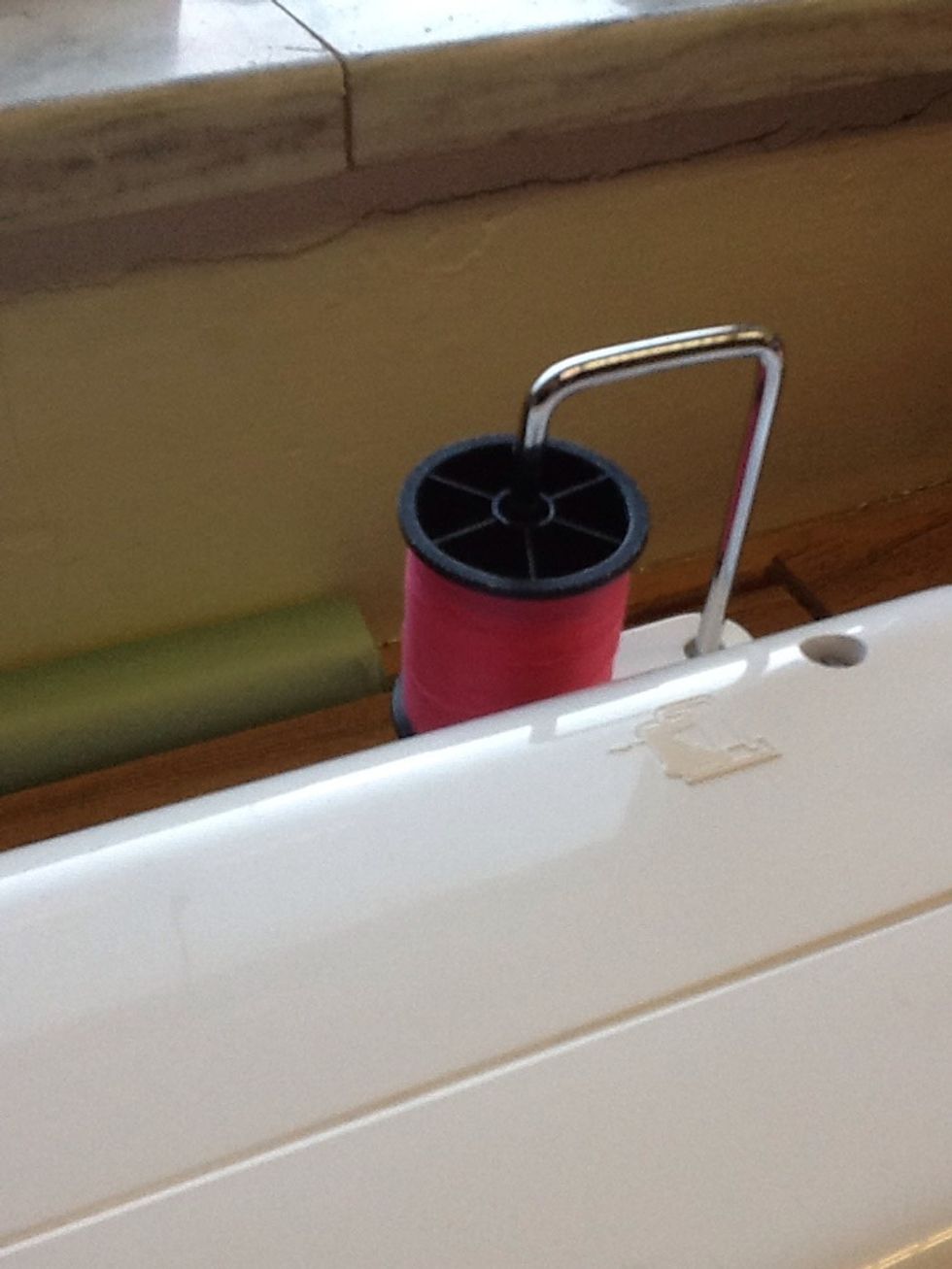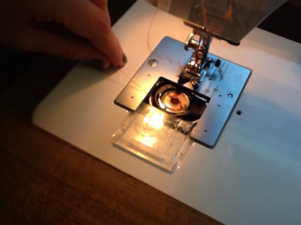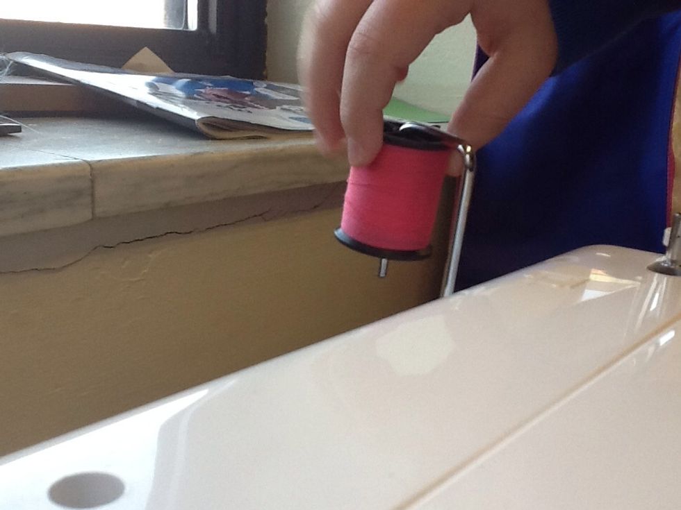 Hold the thread off to the left so it doesn't wrap around the needle.