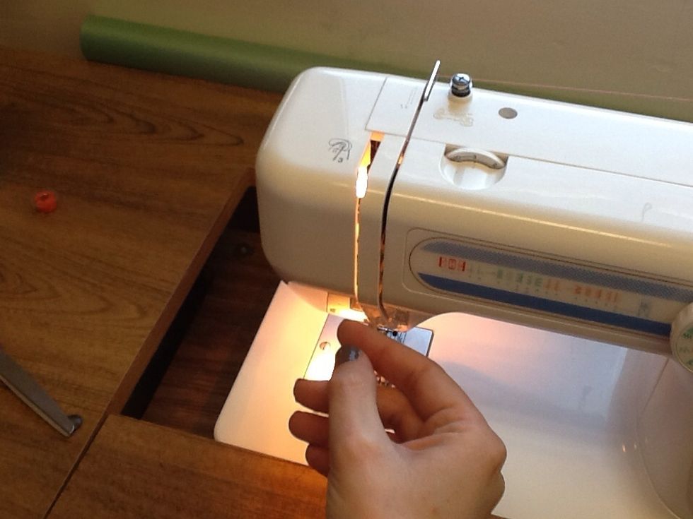 Pull the two tails off to the left then turn hand wheel towards you bringing the needle all the way down and all the way up.