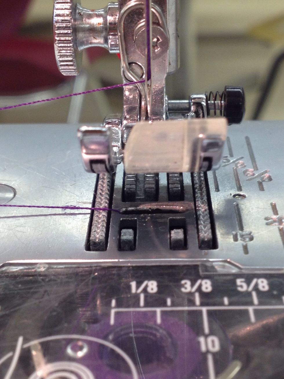 Pull the thread through so it is coming out of both the needle and the bottom of the machine.