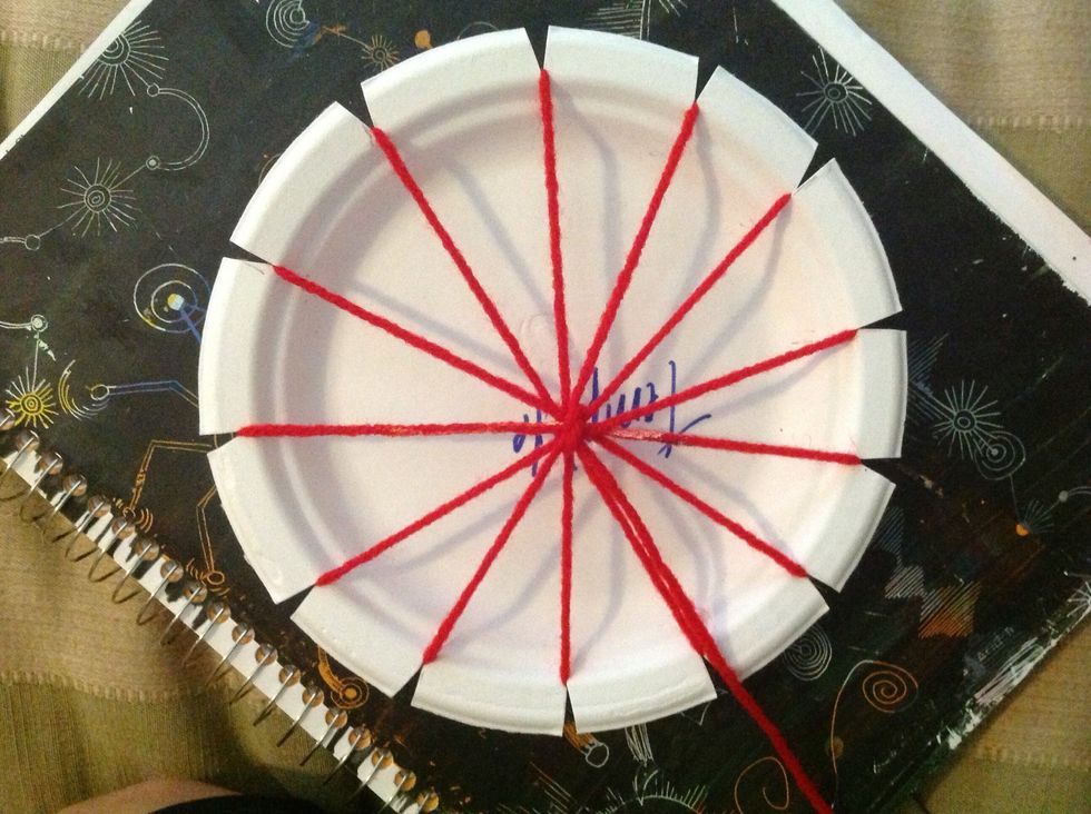 Flip your paper plate loom over. Bring your yarn across the center.