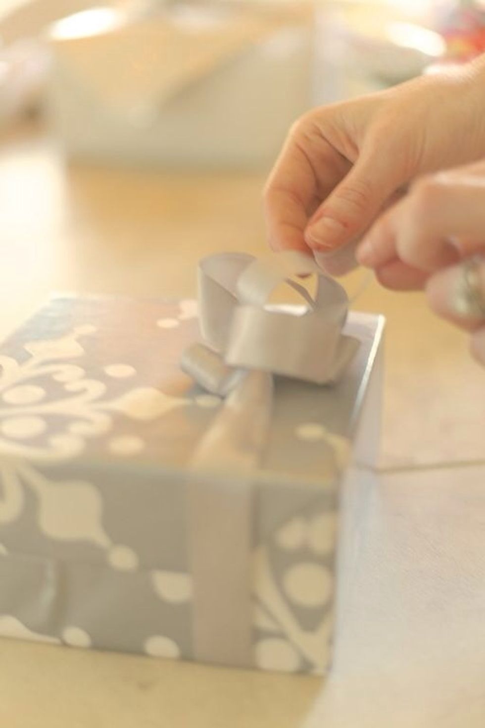 Place the ribbon under the gift and make sure each side is equal in length. I like the satin side of the ribbon out. Tie a knot in the center as tight as you can and hold the knot in place.