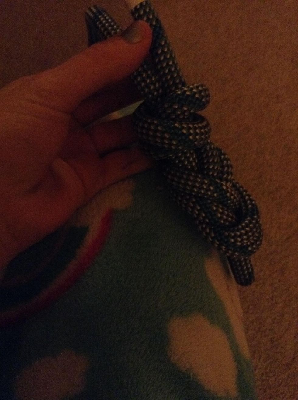 Once you have tied your figure of eight ( i have a guide for) take the left over rope and..Hold like soPlace rope over thumbWrap round the backRound the frontAround the back againAnd up through the holeAnd out the other endPull tight