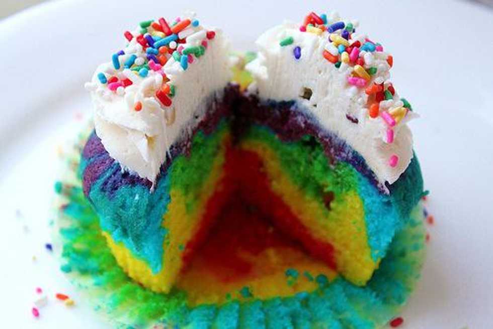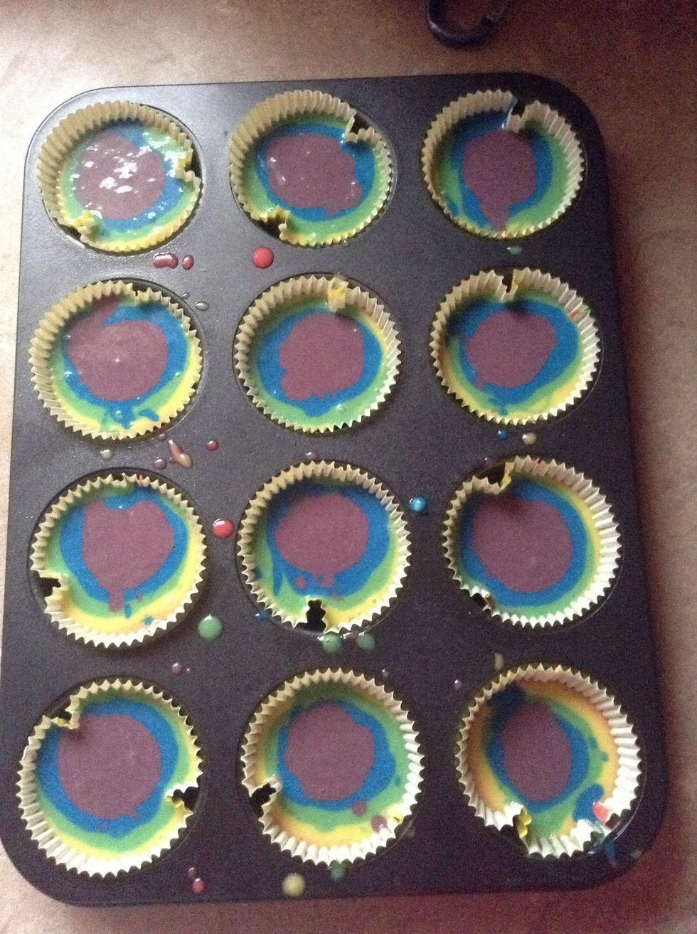 Then spoon one teaspoon of the orange batter into the center on top of the red batter. Continue this step yellow,green,blue and purple batter.