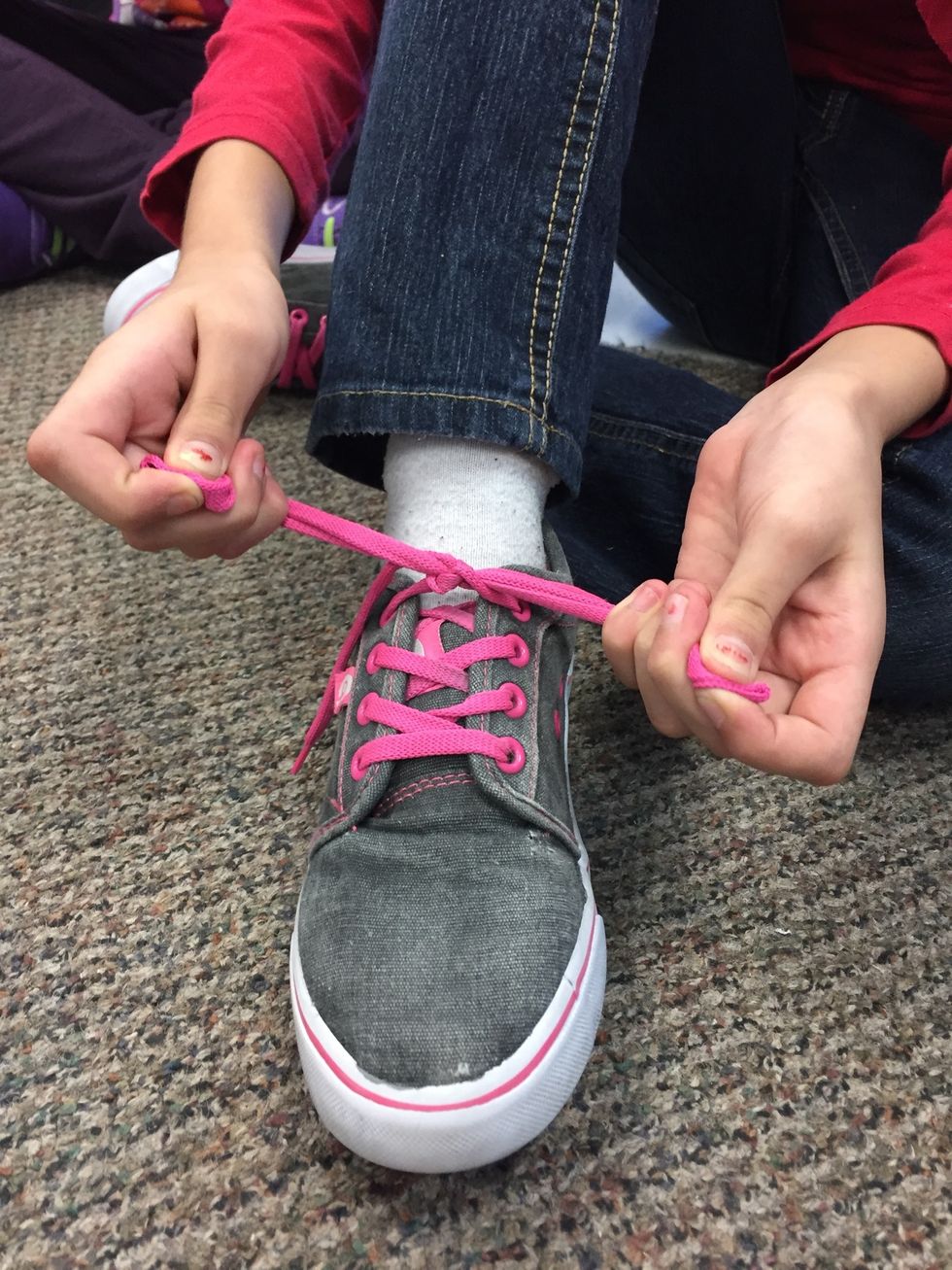 Next, Put one lace through the triangle made by the x to make a knot.