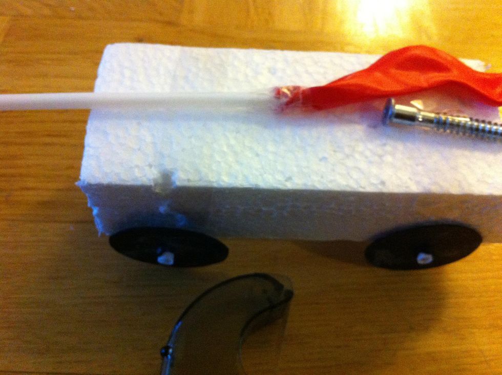 Klipp av två bitar sugrör som kommer att fungera som hjulaxlar. De får gärna vara någon centimeter längre än vad frigolitbiten är bredd.