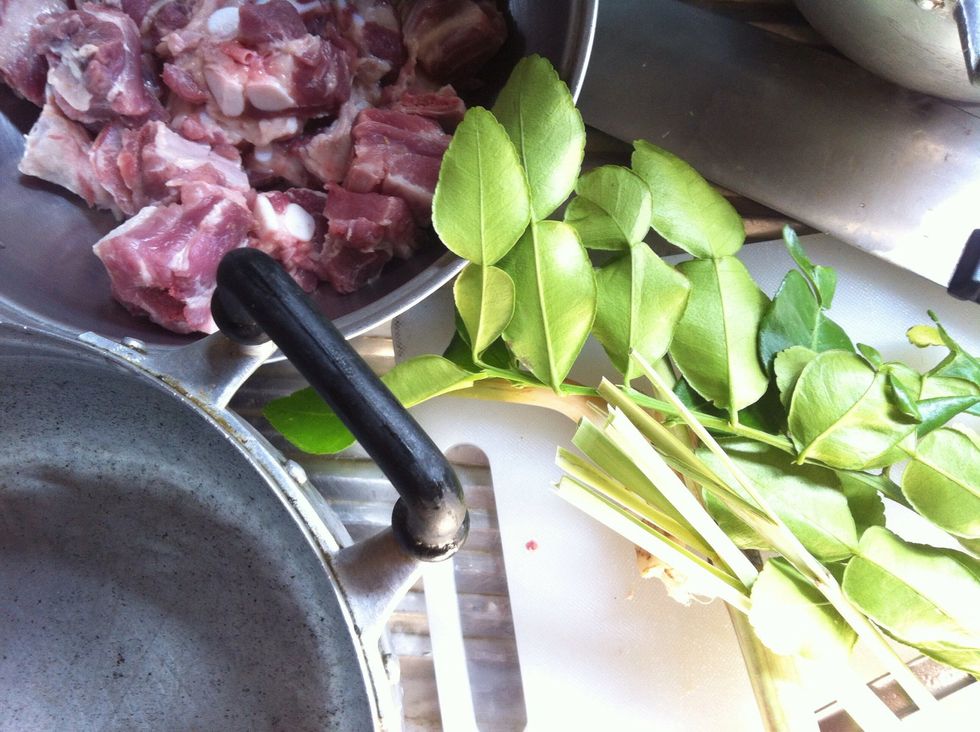 เติม ข่า ตะไคร้ ใบมะกรูด และ กะเทียม หอมแดงโขก / เกลือ นิดนึง รอจนน้ำเดือด