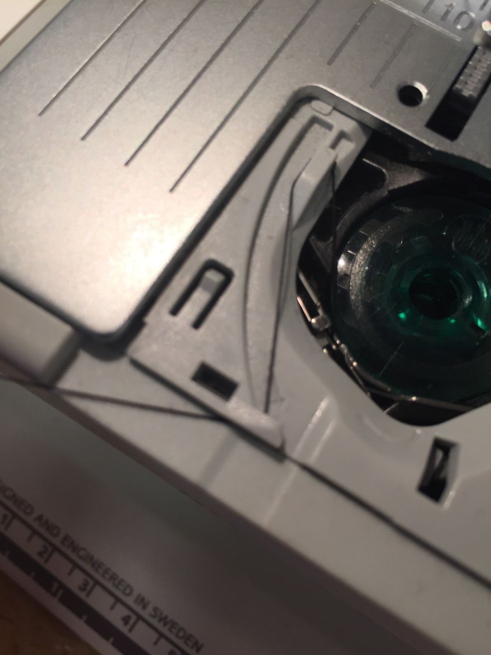 Led sedan tråden neråt runt den grå del som är nere till vänster. Lägg tillbaka platsbrickan rätt. Nu har du trätt maskinen!