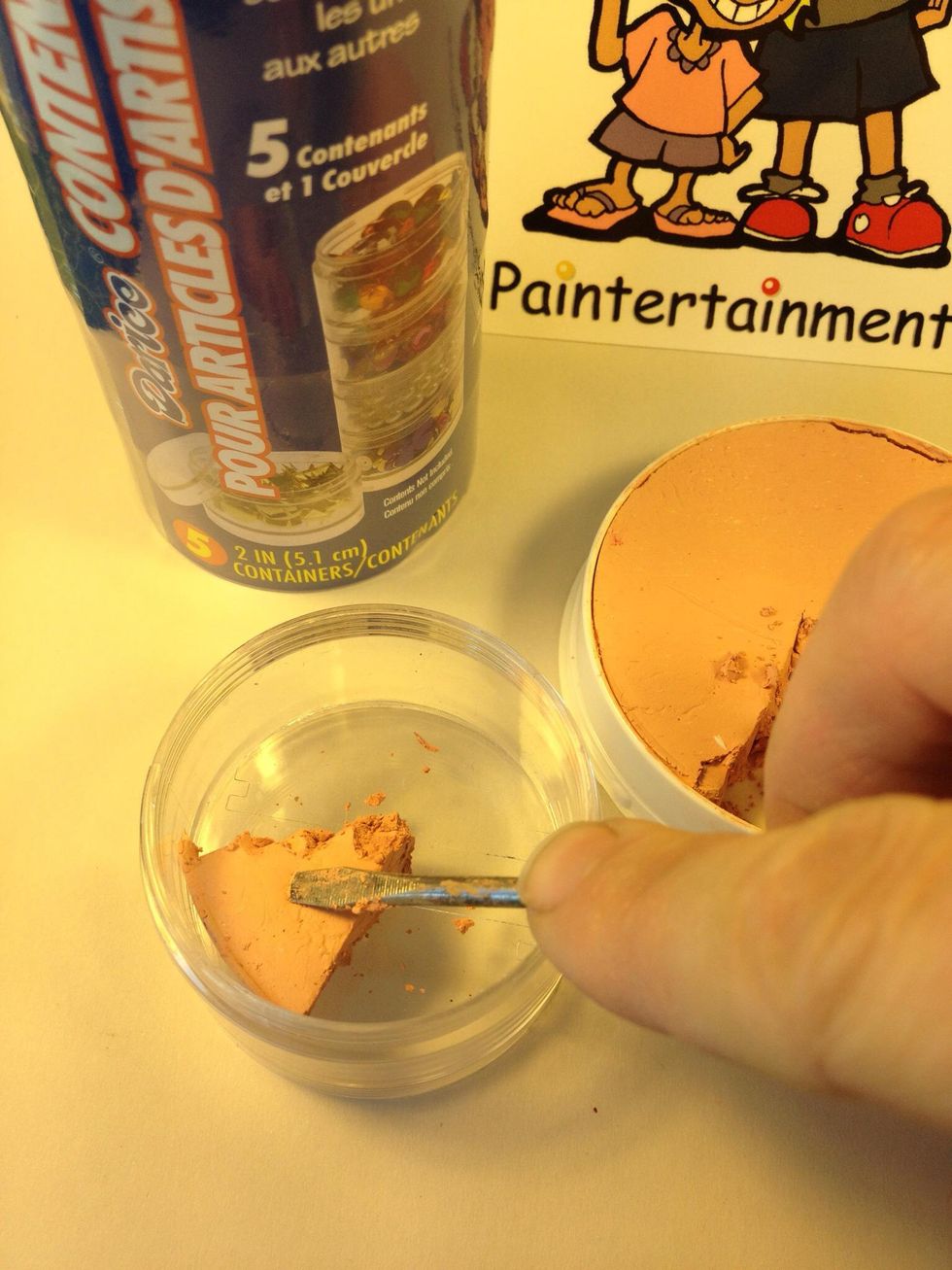 I use this same method to transfer all of my 2.5 oz Kryolan paints to the screw-together jars that I use them out of. You can find these, plus palette boxes & refill containers at paintertainment.com!