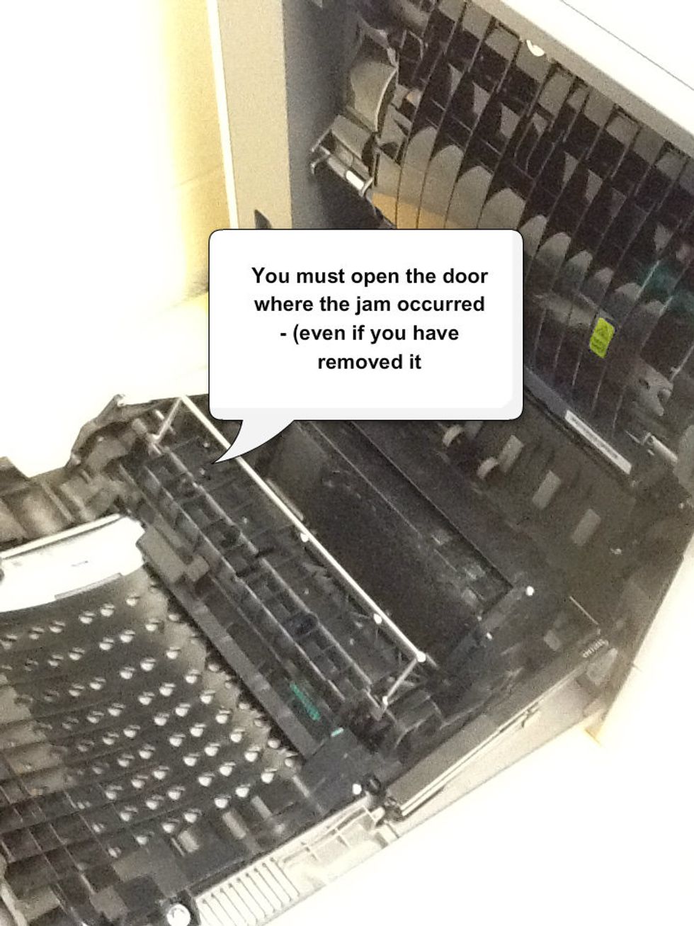 Once you have opened and cleared the paper jam, press continue to "reset" the printer.