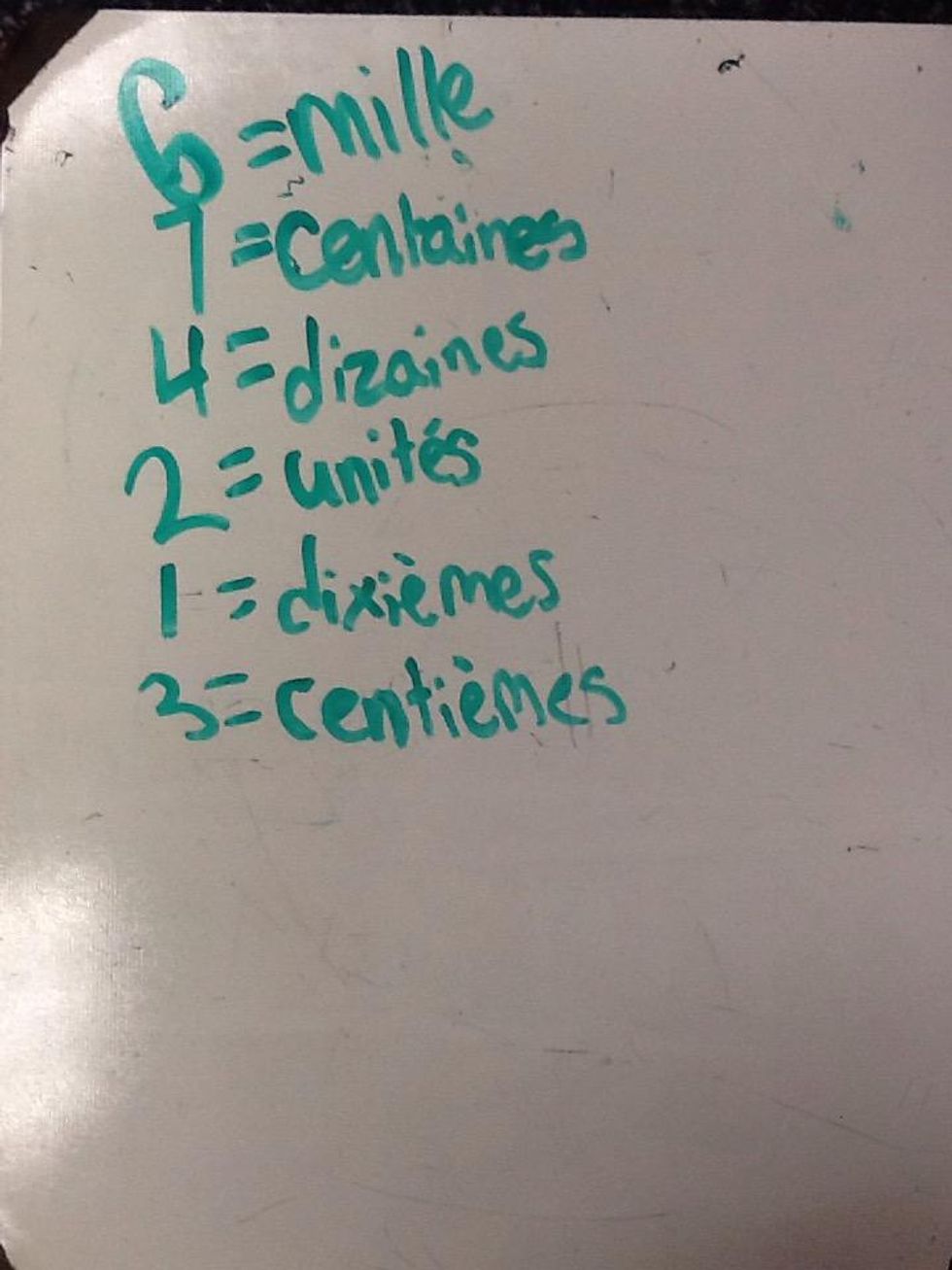 Crée un tableau avec six colones. Dans la premier colones écrie milles après mets centaines,dixaines unités,dixièmes, et centièmes .Noublie pas le points.Cherche les nombres et mes dans ton tableau.Après trouver les valeurs de positions!