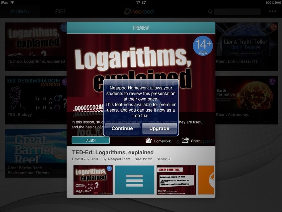 If you have a Silver account, Nearpod will let you know that you are about to enjoy the Homework feature as a trial (you can use it in 5 different Nearpod sessions). Tap on 'Continue' if you agree.