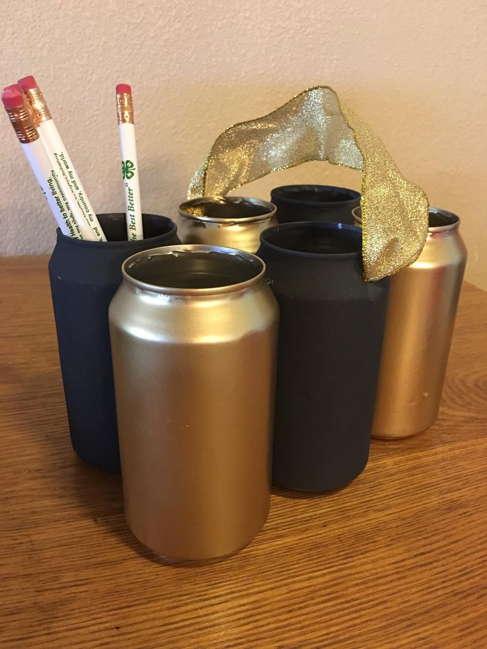 Once you have your rope connected you can now fill up your cans with whatever you like. (Ex. Pens, Pencils, Colored Pencils, Straws, Eating Utensils) You can use whatever you like! Make it your own!
