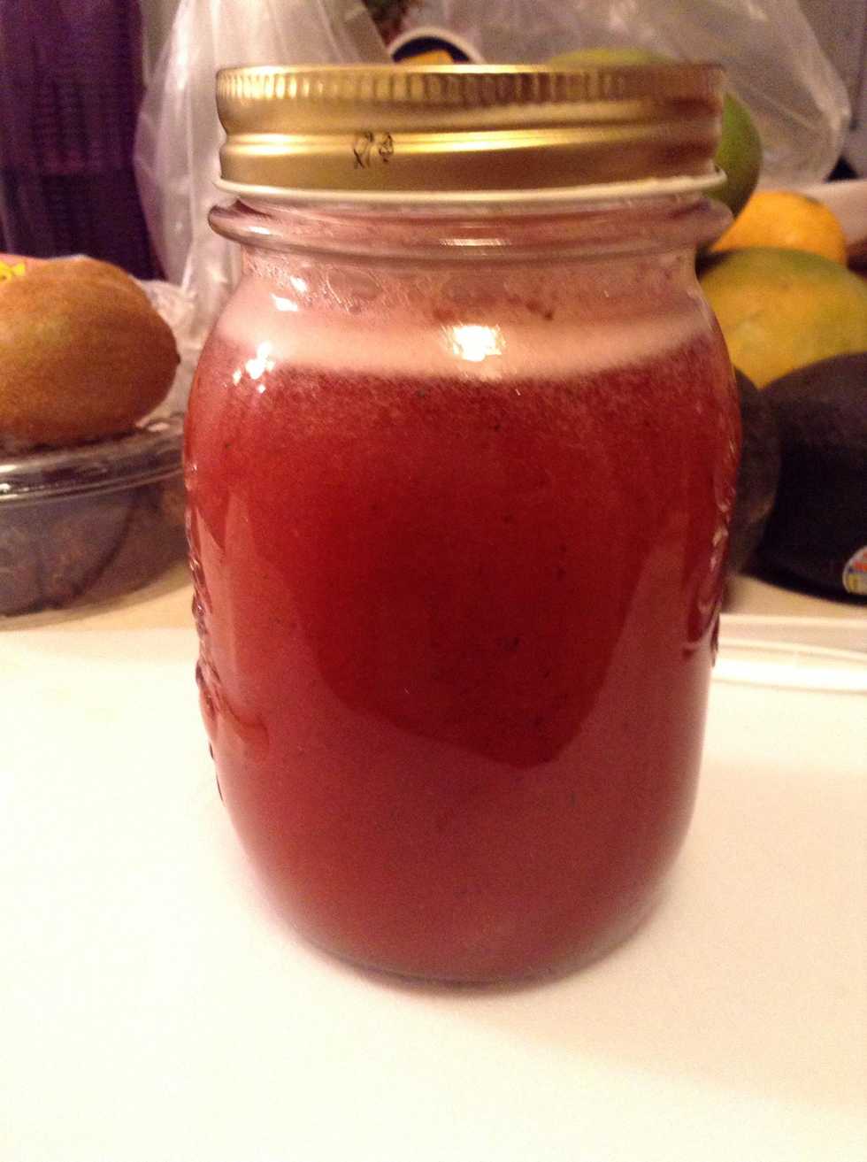 Then fill the jar with cold water. Add sweetener and lemon juice to add to the flavor. If you desire you can add more of the berry smoothie for more of a berry flavor. Shake or stir. Then enjoy!