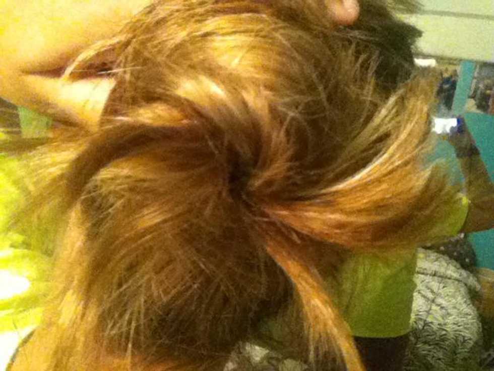 After the 2 are twisted together, wrap it around the beginning of the top ponytail. Then put hair tie around to hold.