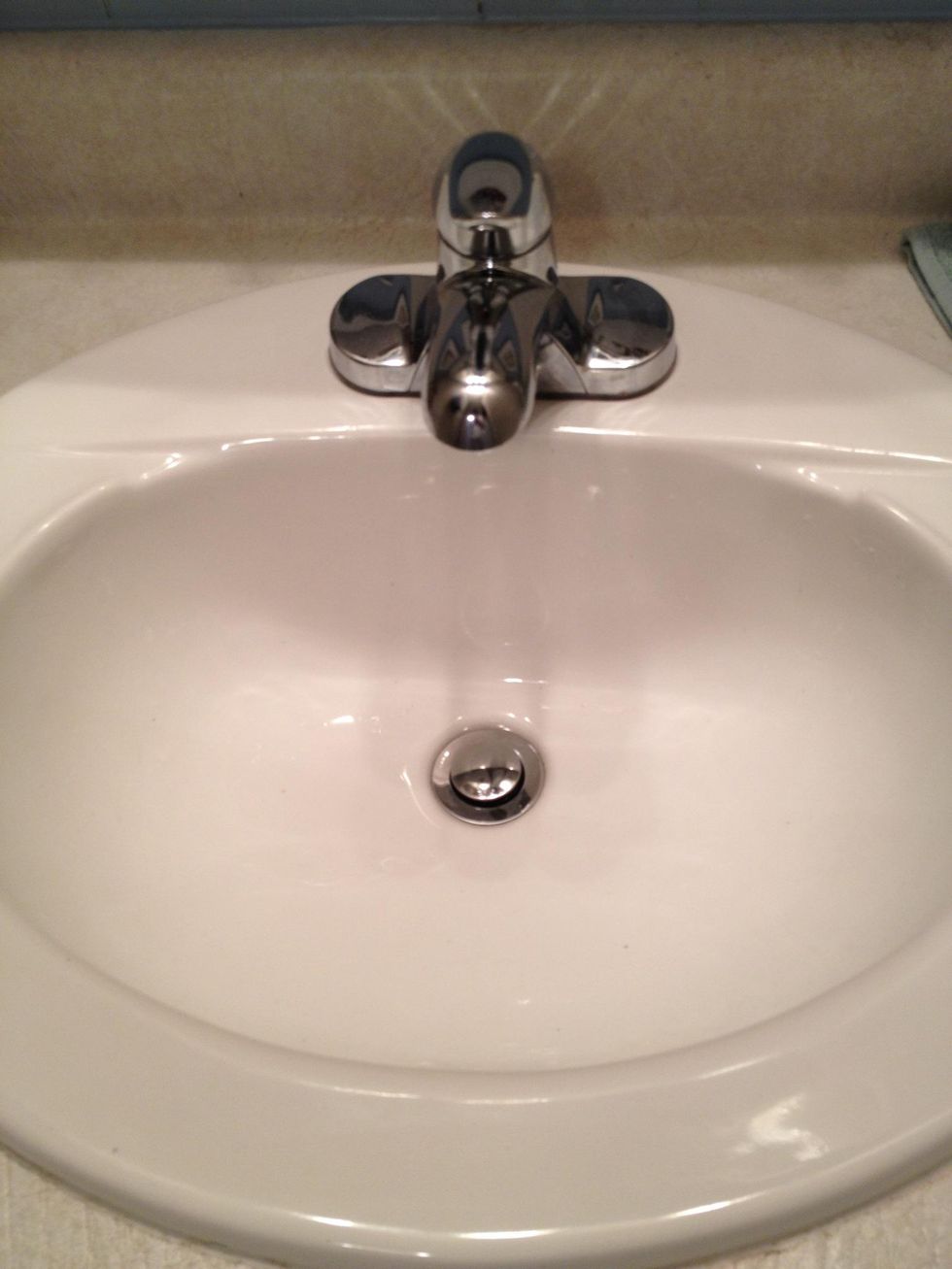 Plunge until the drain is unclogged and water drains quickly. Most of the time the bathroom sink is clogged with hair, using chemicals may work but Do Not use them if you have metal pipes.