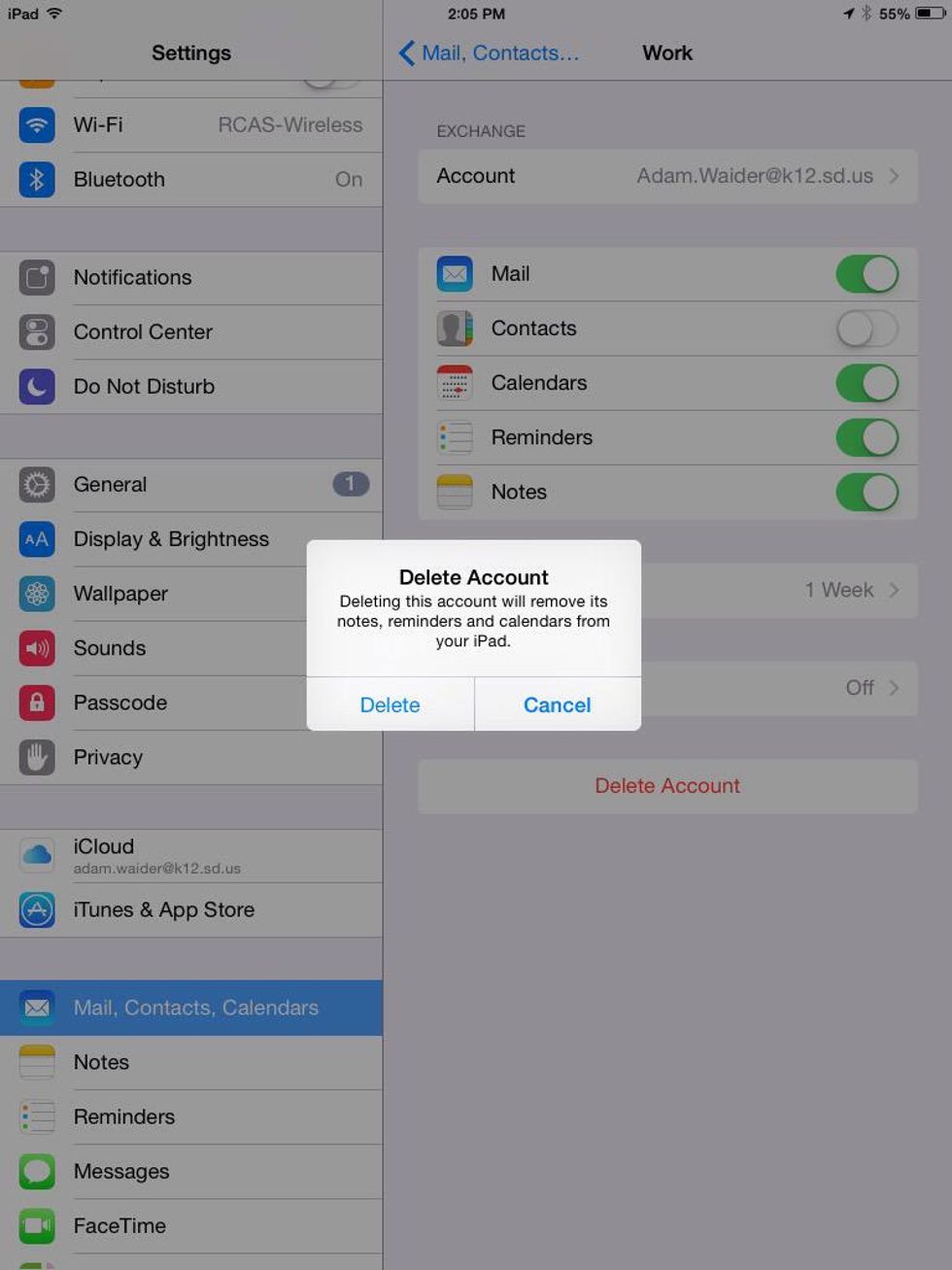 Scroll down and tap "Mail, Contacts and Calendars." Then tap on the account that you would like to disconnect. For the purpose of this tutorial we will use "Work" which is an exchange type email.