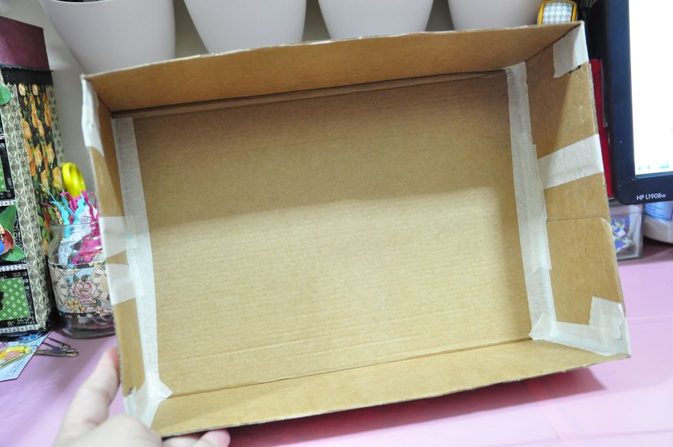 Prep your shoebox. I used masking tape to secure the sides, edges and flaps.