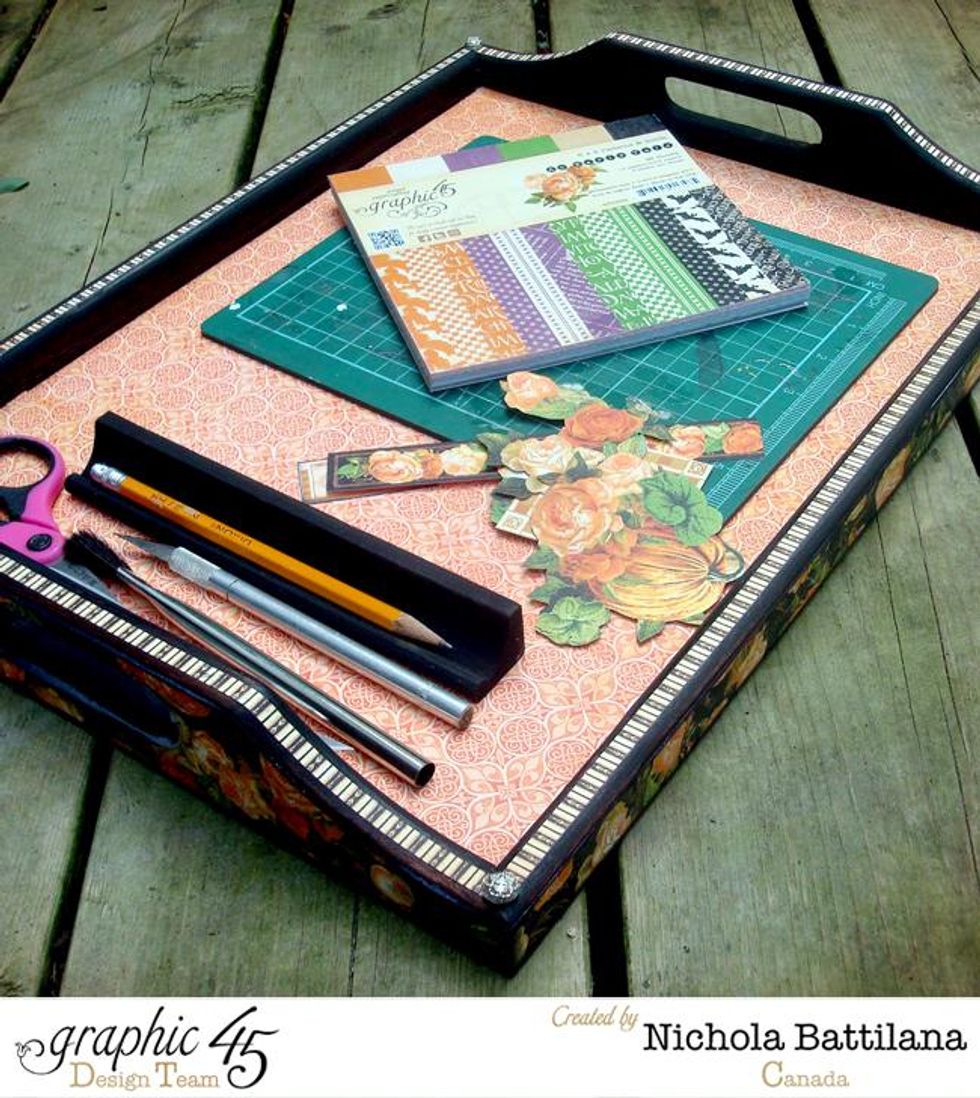 Finally, I paint a Scrabble tile holder black and trim the flat edge with same paper that covers the bottom of the tray. I affix this into place to help keep my tools from rolling around the surface.