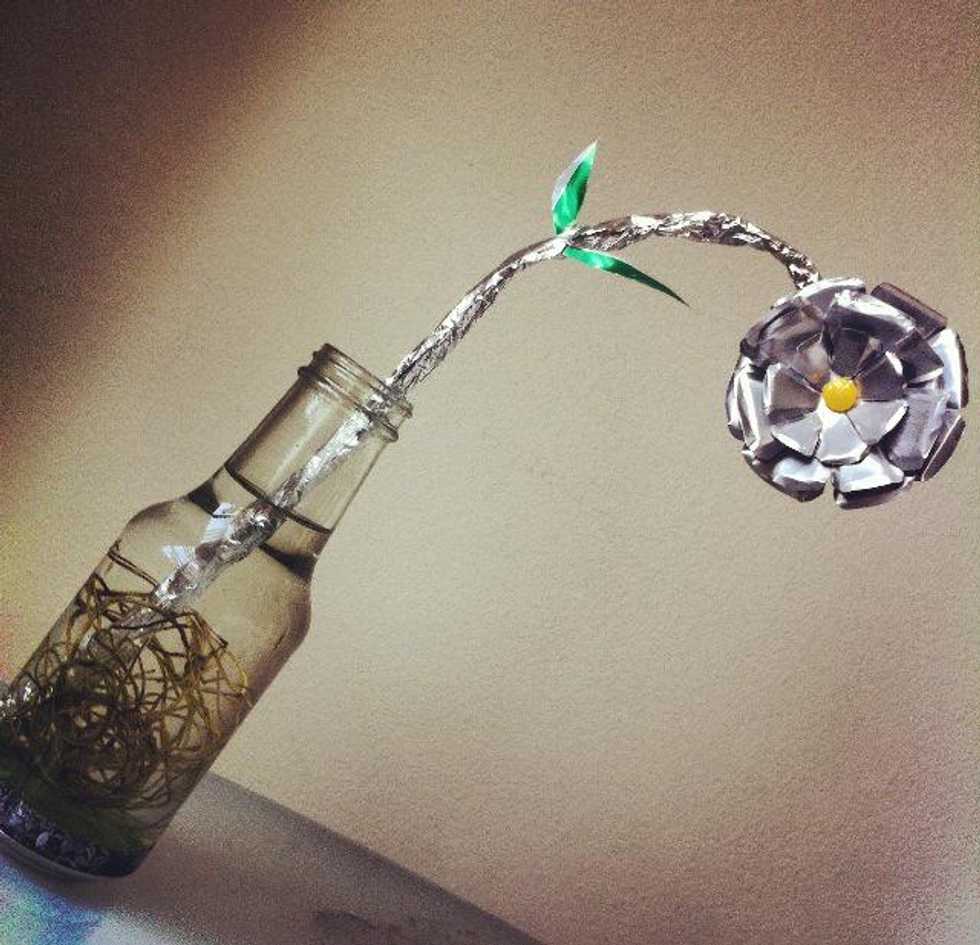 Use aluminum foil to create a stem for the flower and the extra tin to make small leaves. The end result is a simple stylish flower with a metallic look to decorate your space.