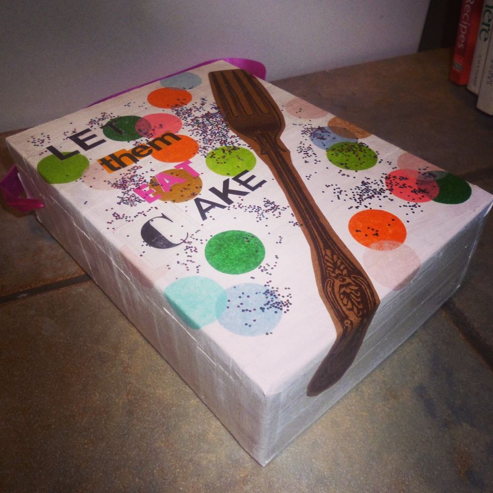 I used Mod Podge to decoupage my design on the box. Add Mod Podge then start gluing your cut outs to the box. At the end I always add glitter. Why not!