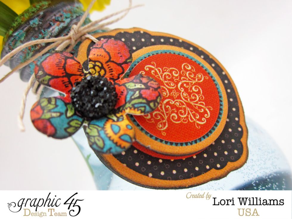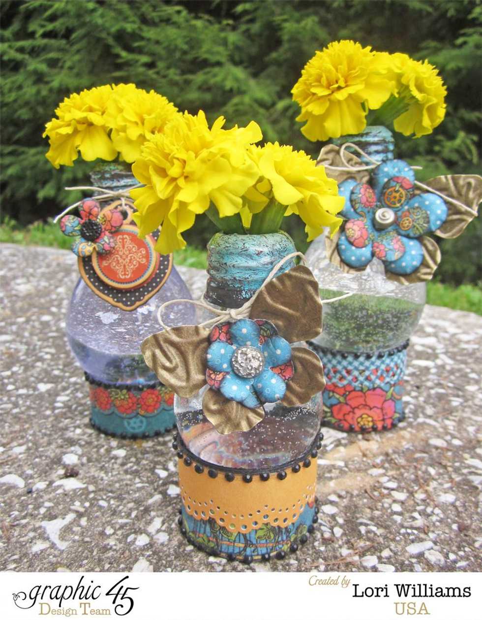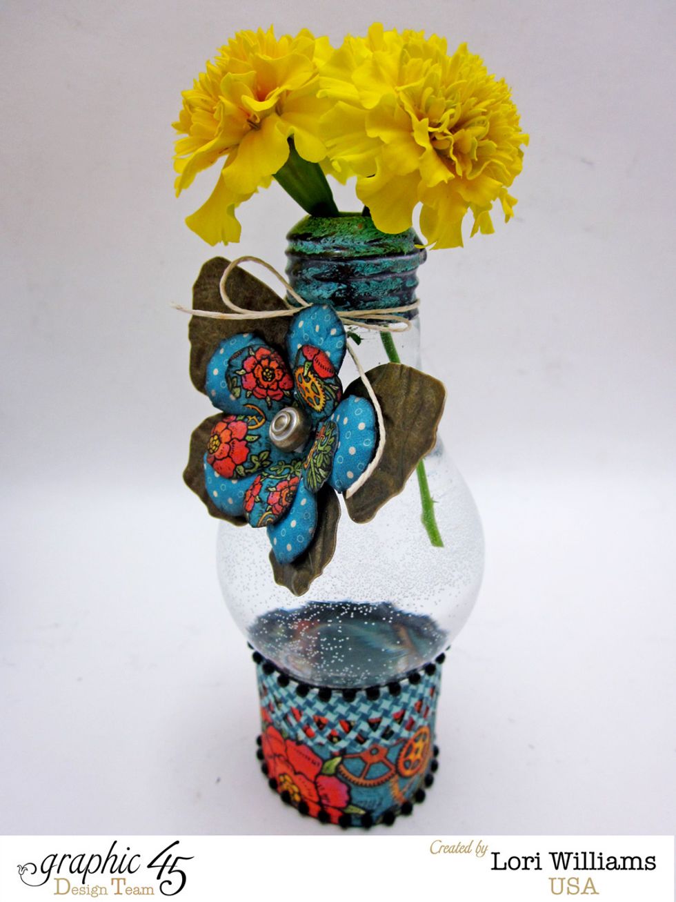 For this mini vase used the Graphic 45 Steampunk Spells stickers, chipboard and flowers to embellish.