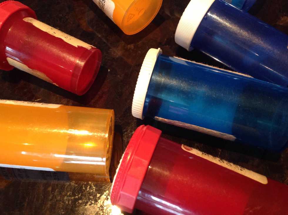 Prepare your cleaned empty medicine bottles by colour for each family member by lining them up in a row with opened caps alongside.