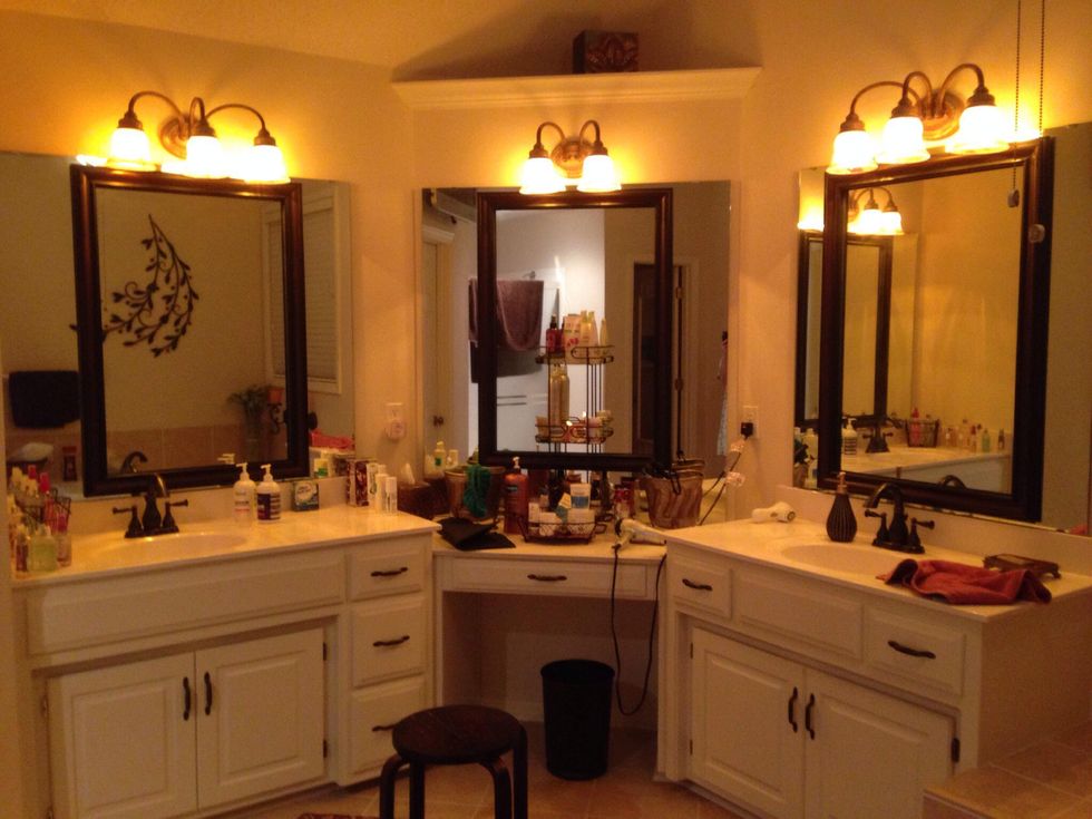 The mirror is now up to date with a pretty cool effect. (These are actually light weight plastic frames that look exactly like wood.)
