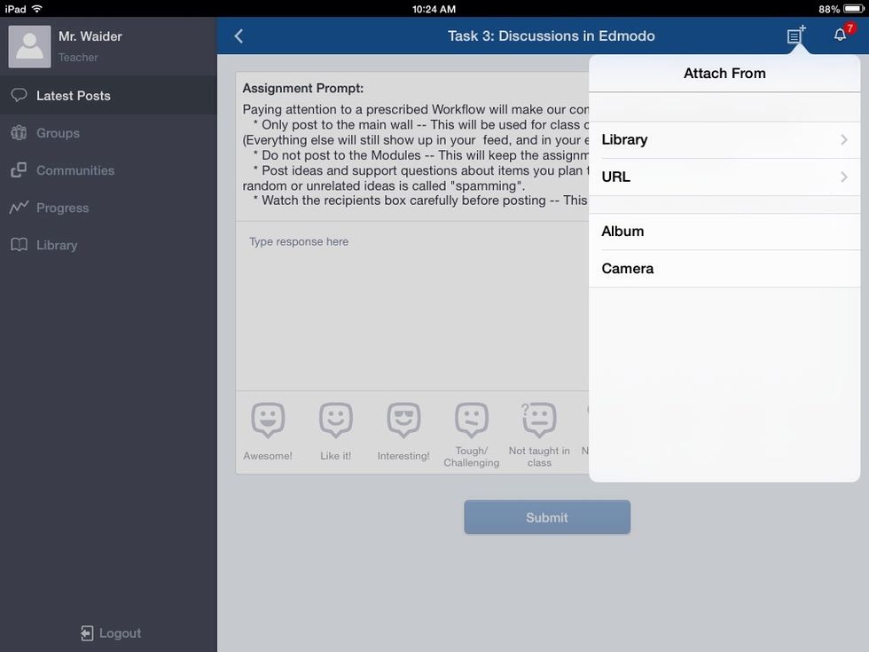 Tap the "Attach From" button and choose album for pictures or screen shots.