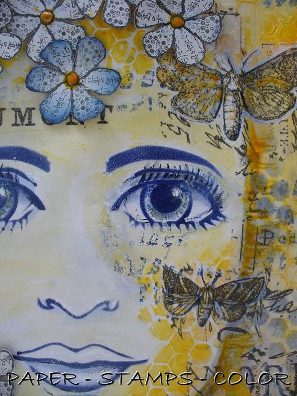 Sponge over Beehive Stencil to create some shadow outside the face. Add shadow to the eyes with a blue watercolor pencil, and touches of yellow as shown. Stamp randomly with script from Magenta.