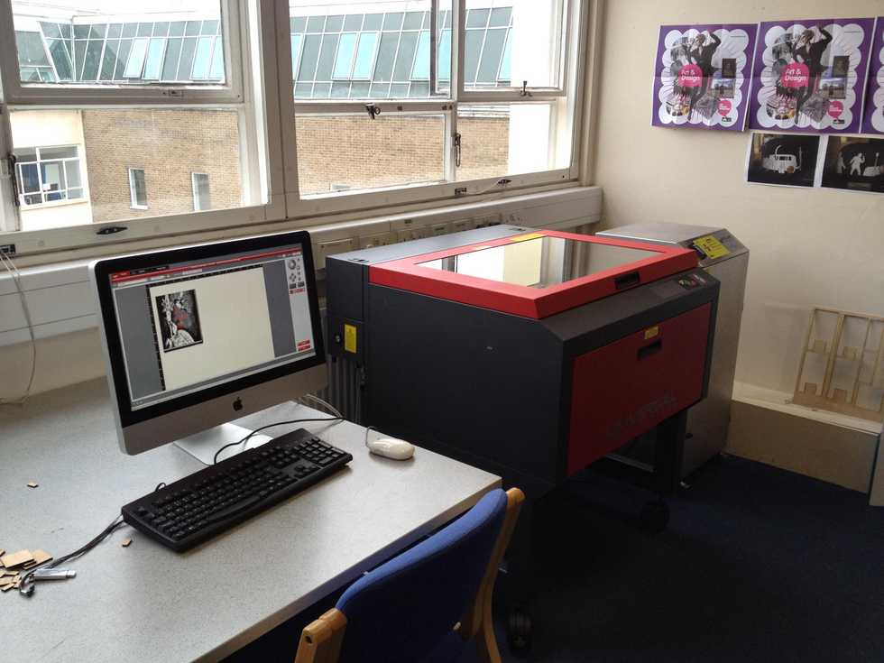 To open the laser cutter utility, click on the red and yellow logo down on the bottom right of the screen next to the clock.