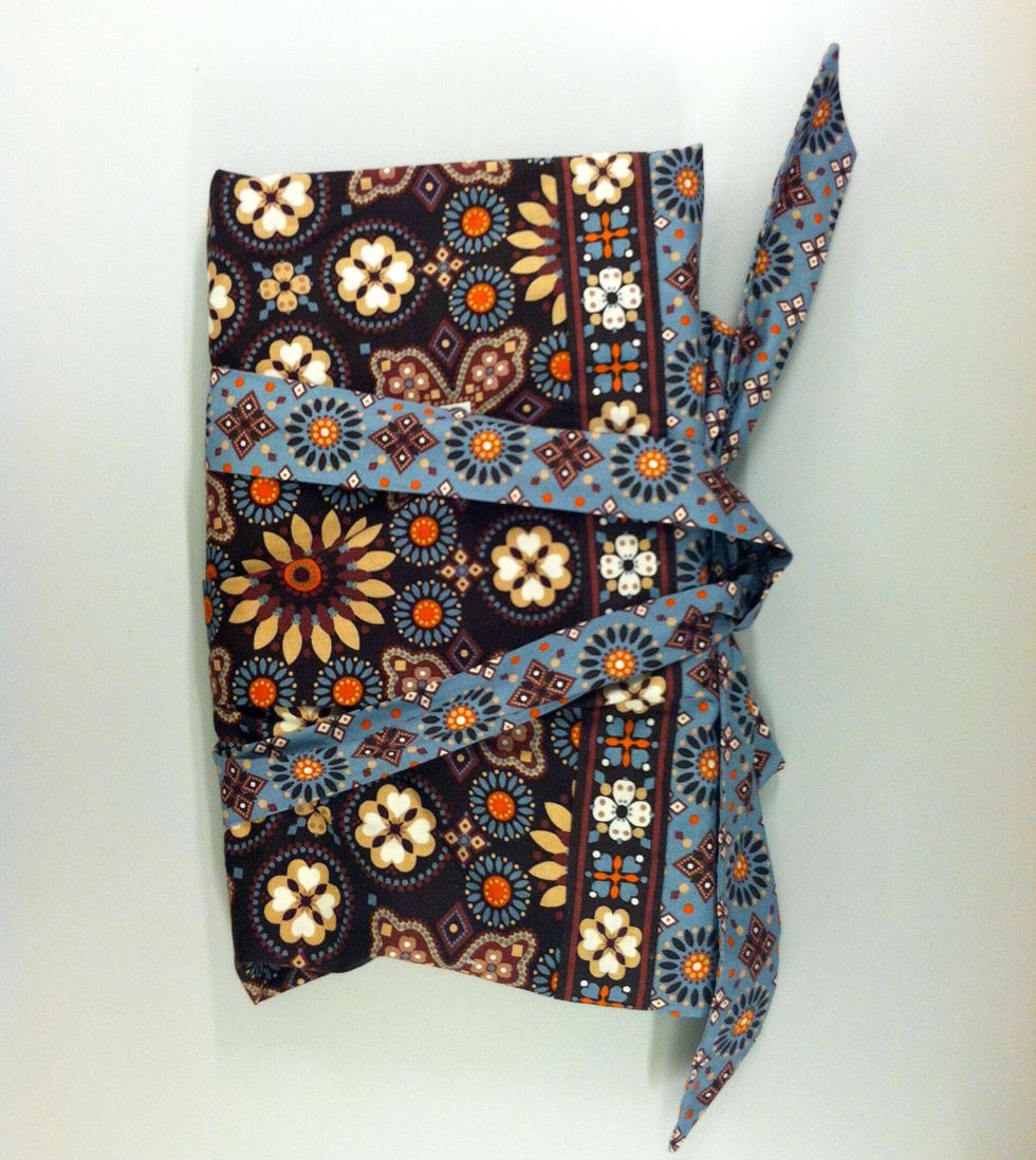 Fold in sides of apron to make a square. Place book at one end of the folded apron.While holding the book in place, fold the apron in half.Wrap the apron straps around the package 1-2 times to secure the book.Secure apron straps by tying a knot.