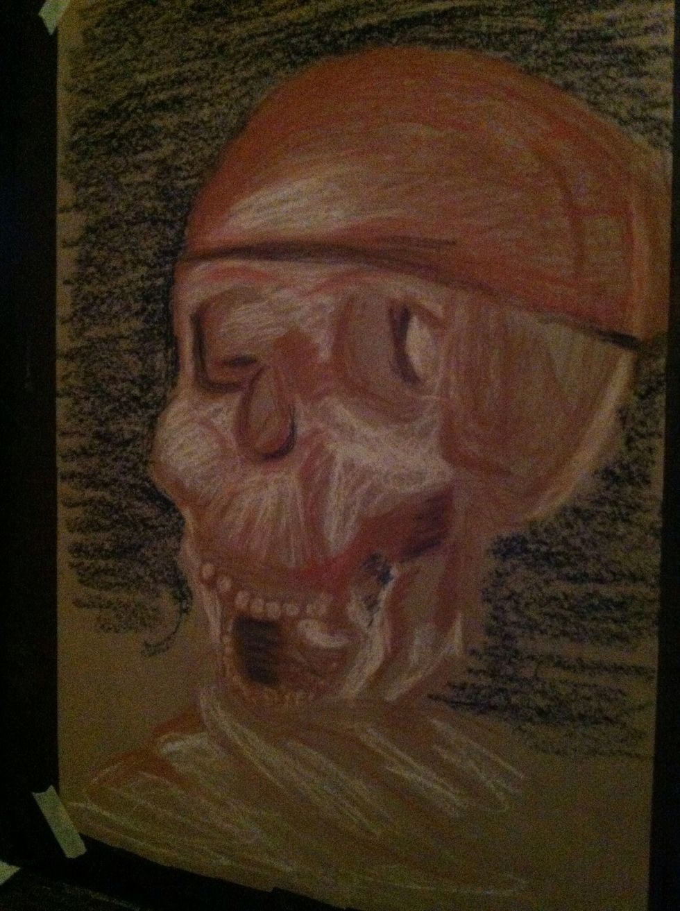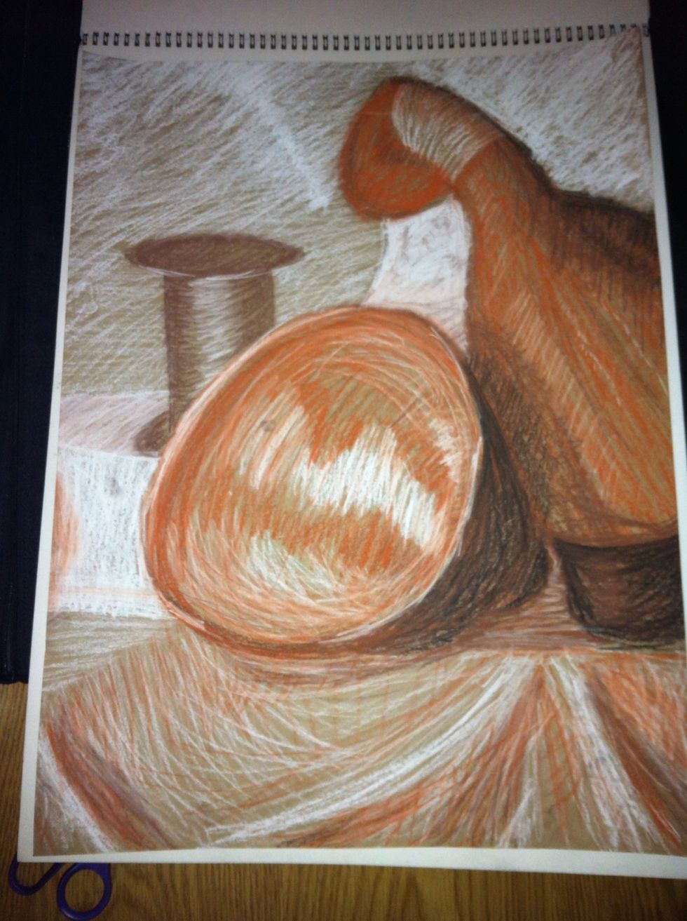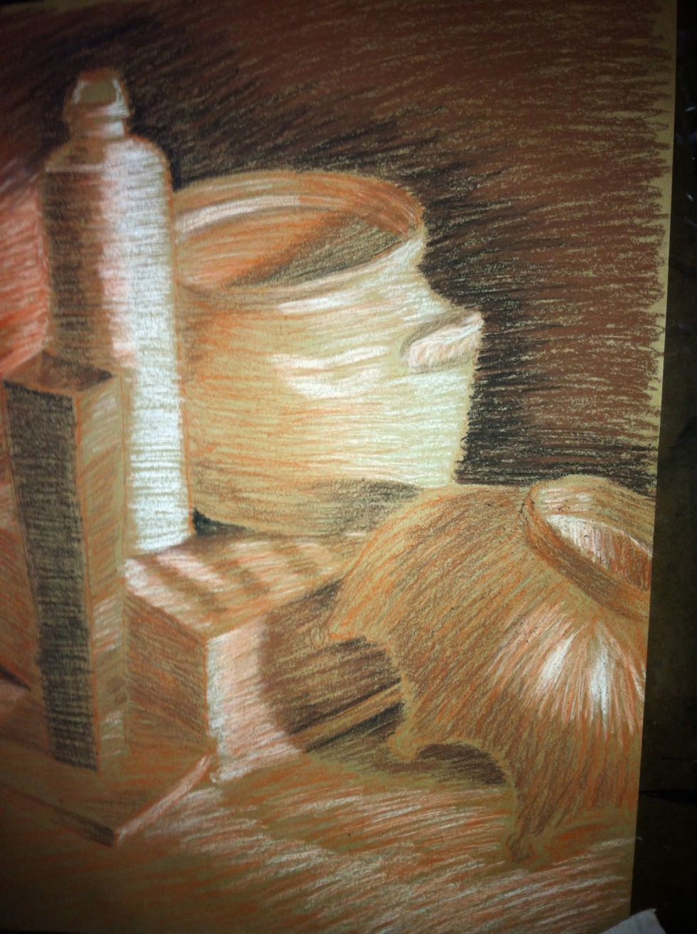 Continue building up values. Use only lines- hatching and cross contour. Do not smudge the conte crayons.